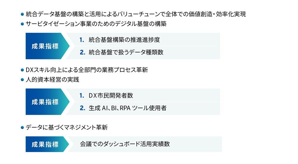 ①統合データ基盤、②AI・データ分析/DX市民開発環境、③クラウドサービスを構築、整備しDX戦略を推進してまいります。