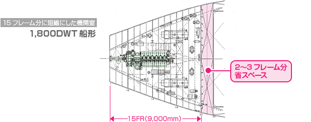 機関全長が短い為、機関室を無理なく、2〜3フレーム分小さくできます。
