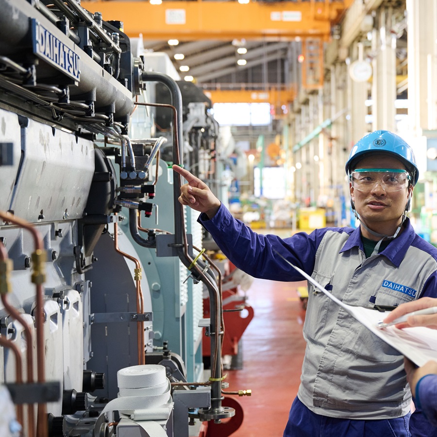 私は船舶用、陸用どちらのエンジンも担当していて、お客様の要望も多種多様なため、幅広い知識が求められます。それは設計に関してだけでなく、エンジンがつくられる工程全体に及びます。設計は上流工程に位置するため、自分たちの仕事の質が低いと後の工程に大きな影響が出てしまうので、自分の力だけでなく、まわりの人たちの力も借りて精度を高めるように心がけています。