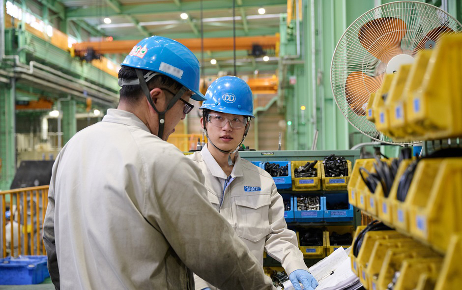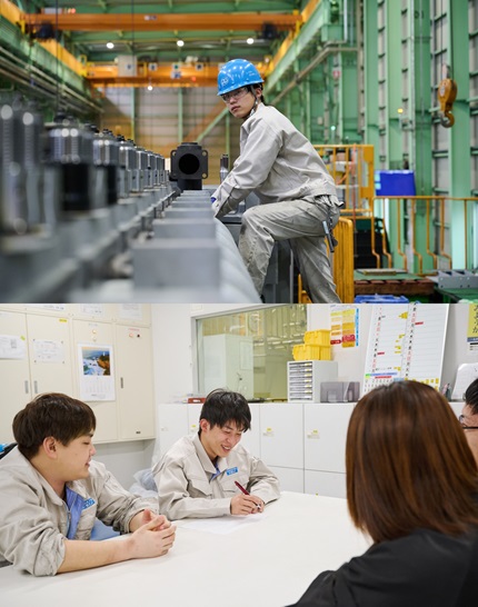 組立係は若い社員が多く、ノリが良い人がそろっているので職場は明るい雰囲気です。大型のディーゼルエンジンは構造がとても複雑で、組み立てがむずかしいんです。私は配属された当初、図面を見ても何をどうするか全然分からなかったけれど、先輩方に教えてもらって少しずつ理解できるようになりました。みんなやさしくて、困った時に相談しやすかったおかげだと感謝しています。